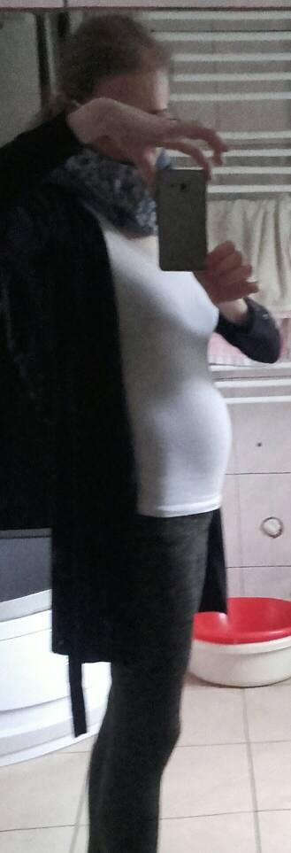 W bluzki się mieszczę, ale już muszę je dobierać tak żeby brzuszek ukryć. Póki co ukrywam, bo ma na razie taki kształt że w ubraniu wygląda bardziej na wzdęcie lub jakby mi się przytyło a nie jak ciąża więc niefajnie by to wyglądało.
