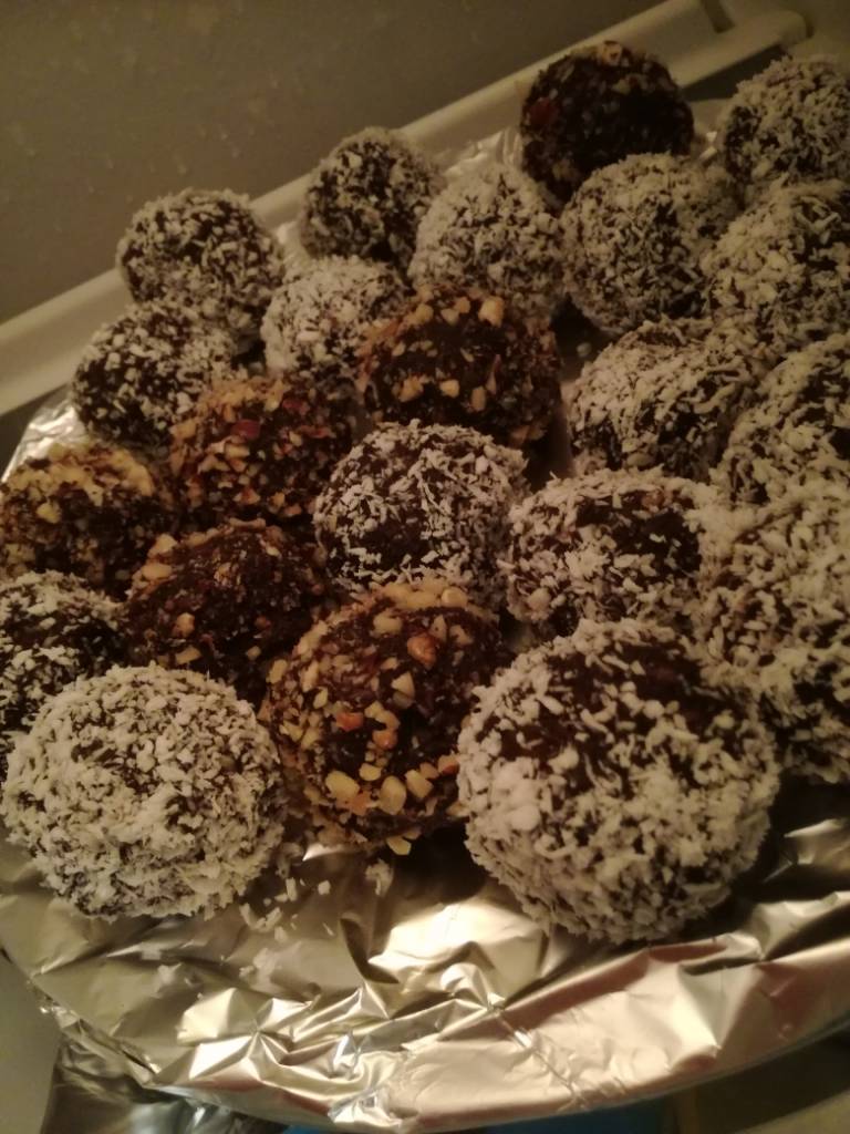 A bajaderki robi się prosto, trzeba mieć jakieś resztki ciasta, mogą być z zakalcem, herbatniki, biszkopty, jakies owsiane -byle bez masy i galaretek. W sumie około pół kilo. Blendujesz to wszystko na pyl, dodajesz 1/3 kostki masła rozpuszczonego, rodzynki (normalnie namoczone w rumie), orzechy pokruszone, czekoladę pokruszoną-ja wszystko blendowalam na wyczuwalne pod językiem okruchy, można dać też inne bakalie, 150-200g marmolady, łyżkę nutelli, jak z białych ciastek to jeszcze ze 3-4 łyżki kakao, można dać aromat migdałowy lub rumowy,lub rum po prostu. Do tego jeszcze mleko, ja dałam 1/3 szklanki bo zakalec był dość mokry- lepiej na oko,żeby się fajnie dały lepić kuleczki, część obtoczylam w wiórkach koko, część w posiekanych orzechach wloskich i laskowych. I do lodówki na jakieś 4 godziny. Robiłam pierwszy raz i wyszło, więc nie jest zbyt trudne - fita z lodówki [emoji6]Zobacz załącznik 933068