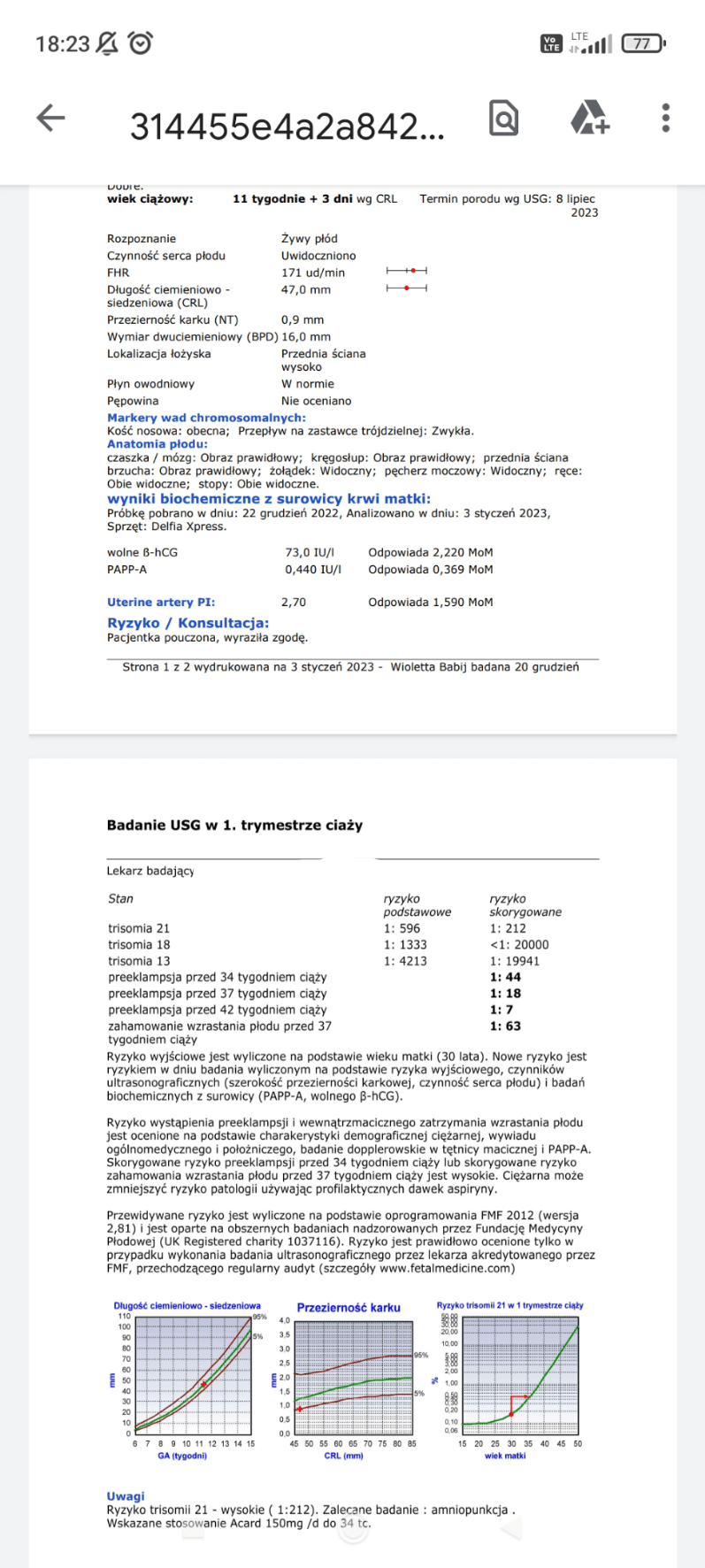 Poczekaj do wizyty 1:200 to nie jest bardzo źle, a to już jest po tych przeliczeniach drugich? Bo mi pokazuje 1:300 po przeliczeniu lekarza 1:6000 nie znam się, ale mam wsrod znajomych też kilka przpadkow co powychodziły takie normy a dzieci zdrowe. I ważne jak usg wyszło bo jeslinlekarz nic nie widział to nie ma co na zapas się martwić (chociaż łatwo mowic)Mój lekarz dopiero za tydzień zobaczy te wyniki. Bo on sam nie wykonuje prenatalnych