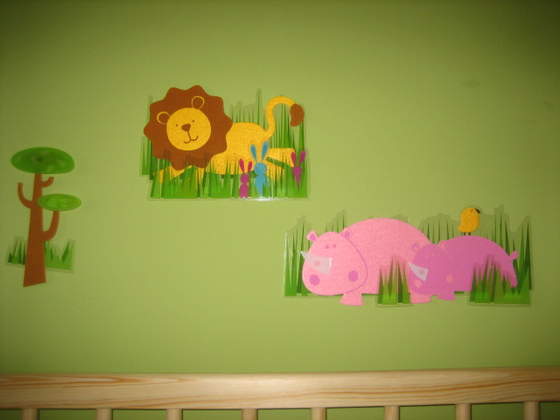 W sobotę w Empiku napotkałam ozdoby na ścianę przecenione z 19,99 na 9,99 (są przy kasach). I tak Karol dorobił się dżungli nad łóżeczkiem. Był jeszcze zestaw kwiatków, śliczny dla dziewczynki i naklejki z piratami. Nie widać tego na zdjęciu, ale naklejki są trójwymiarowe, lew i nosorożce są z filcu, trawa z jakiejś folii. Przykleja się to delikatnie, powierzchnia klejąca jest mała, więc nie zagraża ścianom :-). Fajna cena, żywe kolorki, może któraś z Was się skusi?