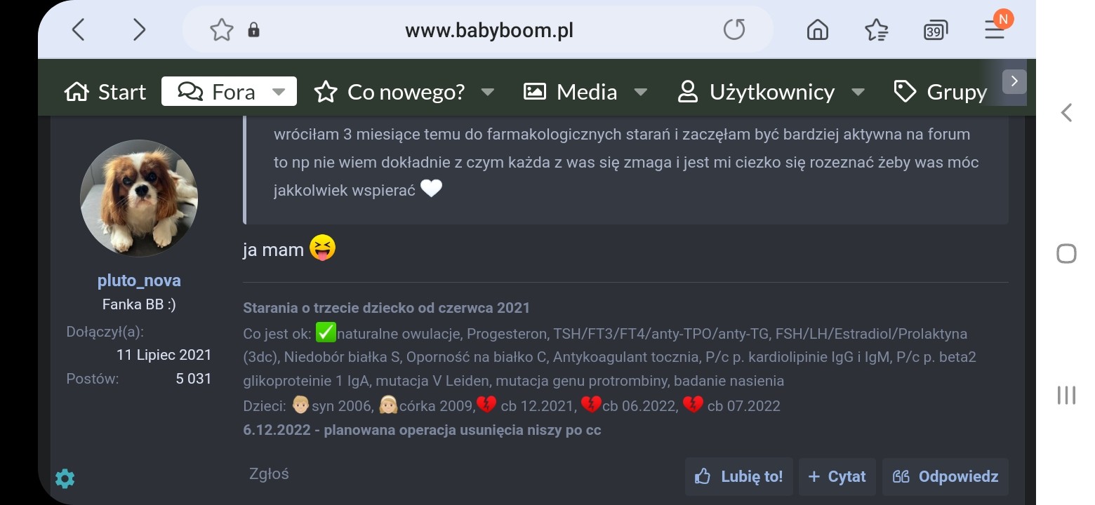 Mi osobiście bardzo brakuje np w opisie ( fajnie byłoby na staraczkach tak zrobić) co, kto ma i ile się stara bo np. jestem na forum od ponad 2 lat (wcześniej pod inną nazwą) przez ostatni rok podczytywałam Staraczki i ogólnie forum ale nie udzielałam się bo miałam pauzę ale teraz jak wróciłam 3 miesiące temu do farmakologicznych starań i zaczęłam być bardziej aktywna na forum to np nie wiem dokładnie z czym każda z was się zmaga i jest mi ciezko się rozeznać żeby was móc jakkolwiek wspierać