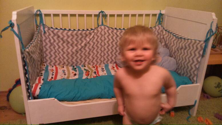 Aob mon na początku miał wielkiego miska obok łóżeczka i tak z 3 razy mi spadł. Ale to wysokość zwykłego łóżeczka. Wkoło ma taki wysoki ochraniacz i ładnie się nauczył szybko tak spać, rano wstaje i się bawi a tak to był płacz żeby go wyciągnąć.
