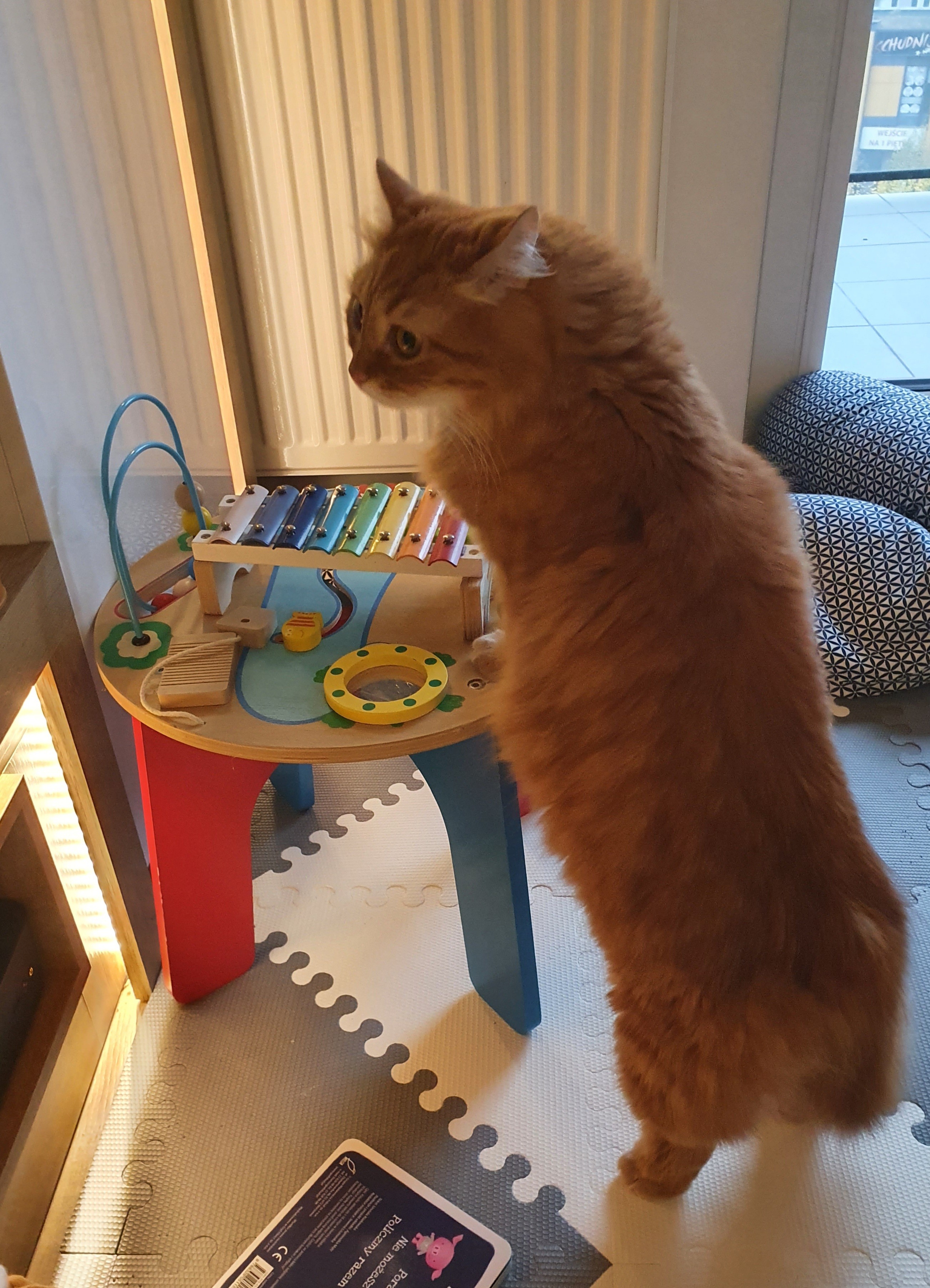 Ale KiciaMamy go dopiero od wczoraj. Mały juz trochę przy nim postał, czyli się nawet interesuje. Jak długo to się okażeFajne są cymbałki, ale on jeszcze tego nie rozkminił. Na razie tymi pałeczkami wali wszędzie tylko nie w cymbały. Poza tym jest mały bębenek, przekładanka, koła zębate i takie przesuwane elementy. Trochę się tym wszystkim pobawił. Mam wrażenie, że główną atrakcją tego stolika jest po prostu zabawa na stojąco