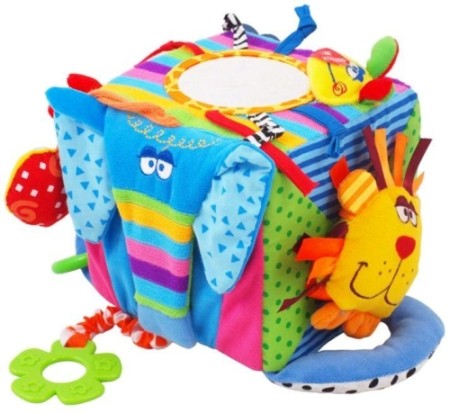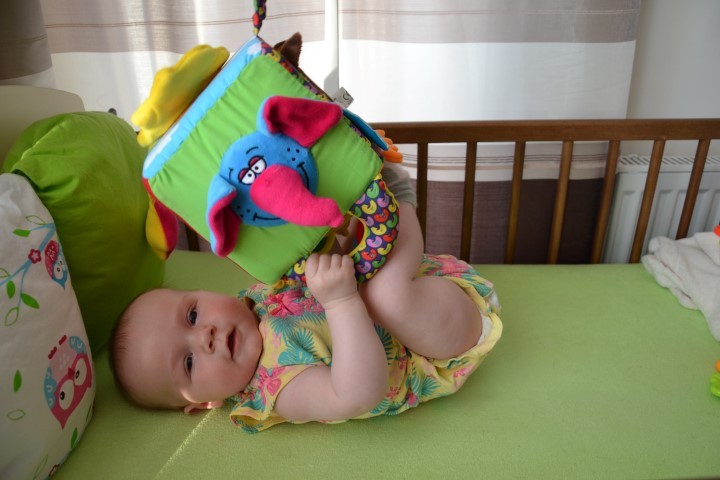 Dużo elementów do ciągnięcia, łapania, dzwoniąca, szeleszcząca, z takimi gumkami które moje dziecko pokochało już u Lali(taką też mamy po siostrzenicy dla maluszków, ale nie wiem gdzie była kupiona)