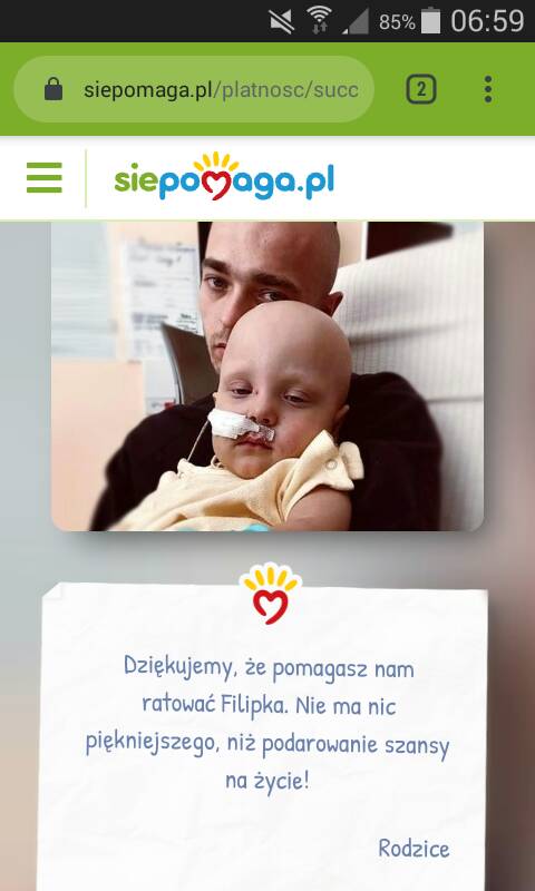 oczywiscie dolozylam swoja cegielke i mam nadzieje, ze wiecej osob to zrobi, bo dla nas czasami to pare zlotych, a dla tego chlopczyka i jego rodzicow mozliwosc uratowania zycia ich skarbu.
