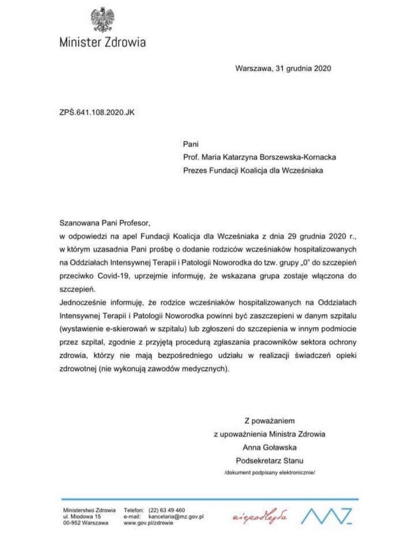 O boze to teraz trzymam nogi mocno do terminu...Dziewczyny, w załączeniu przekazuję Wam pismo Ministerstwa Zdrowia dot. włączenia rodziców wcześniaków do tzw. „grupy 0” do szczepień przeciwko COVID-19To znaczy, że dzieci będą mogły być pod opieką rodziców w szpitalach