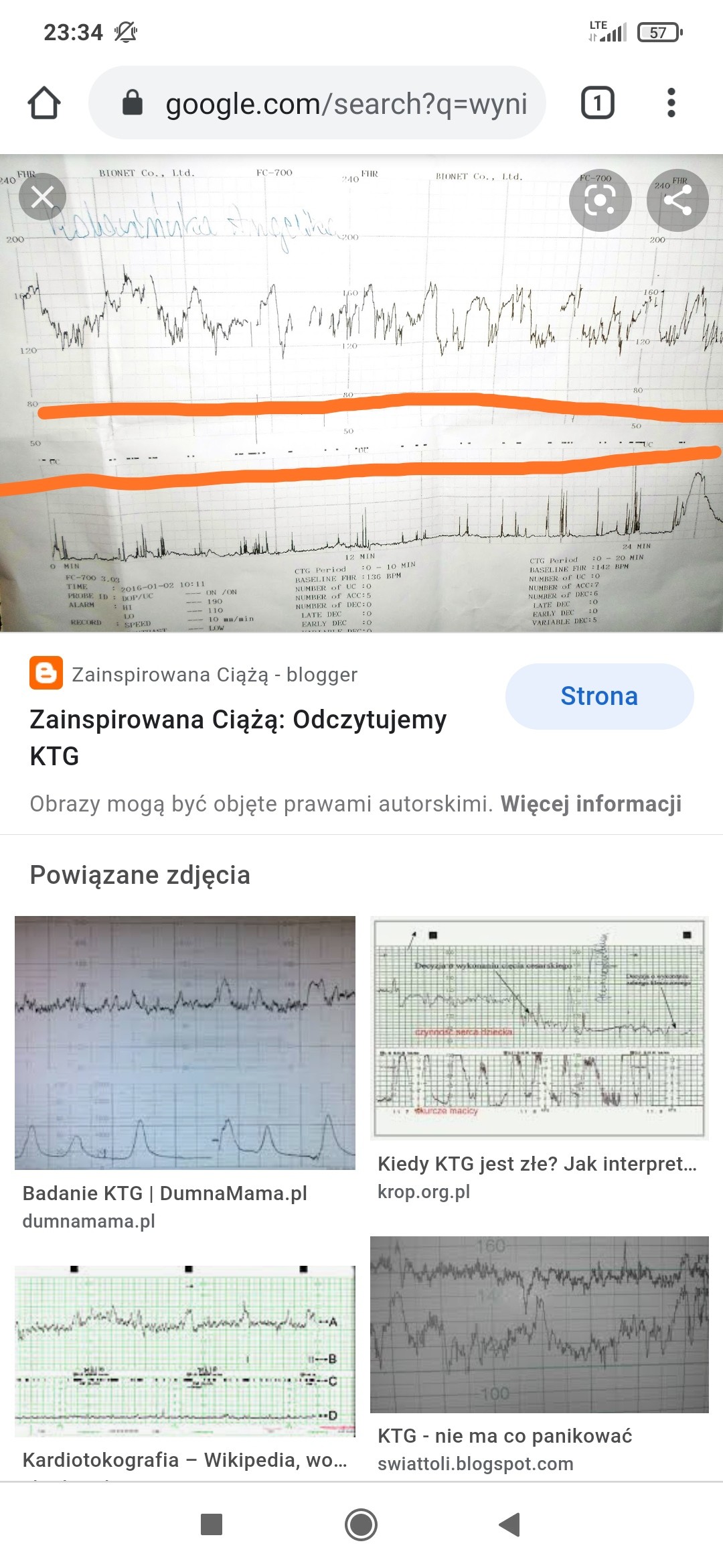 Tutaj jakieś przykładowe ktg z neta wzielam i zaznaczyłam gdzie są ruchy dzieckaDziwne, bo ja miałam wczoraj raz i wszystko wyszło ok, a mały się raczej podczas badania nie ruszał, zresztą w ogóle wydawało mi się, że to nie ma znaczenia, bo ktg rejestruje tylko pracę serduszka i ewentualne skurczeI te "bazgroły" na całej długości wydruku mieściły się w takim zielonym pasku pośrodku, pewnie to jakaś norma, a Ty jak miałaś?