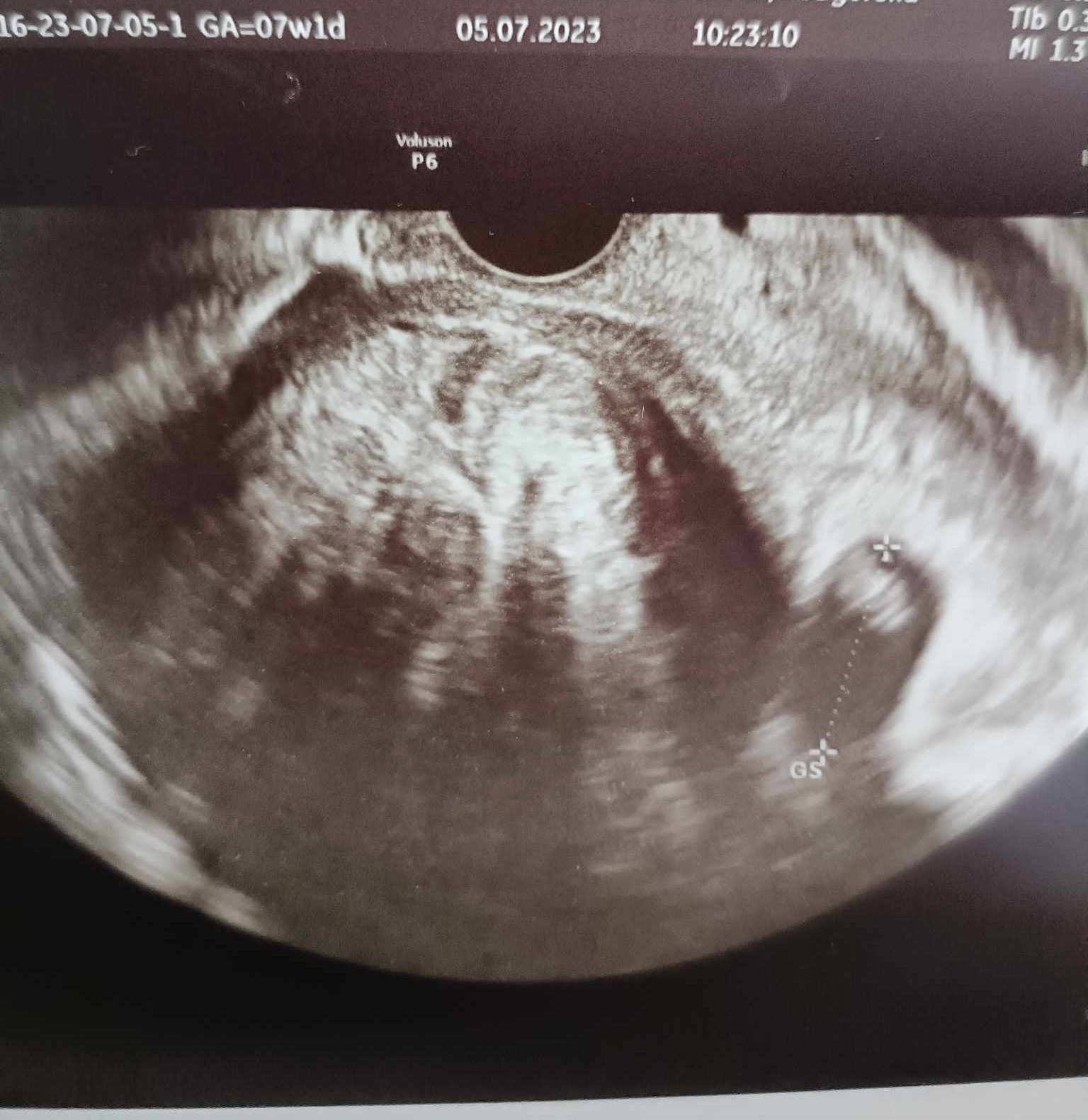 Melduję się i ja. Jak to określiła lekarka, mój zawodnik ma już cały centymetr, a serce bije jak dzwon. Termin z om idealnie pasuje do usg, 7w1d. Tyle, że jest problem, bo bardzo urosły mięśniaki. Największy na ten moment ma 7,5cm i zepchnął kropka (widać na zdjęciu, mały kropek po prawej stronie, a ta duża kula na środku to mięśniak)Przez to obraz na usg też był bardzo niewyraźny. Mimo braku miejsc lekarka wpisała mnie na przyszyły piątek, zostanie dłużej w pracy i będę miała zrobione kolejne usg na innym aparacie. Z zaleceń na teraz to dostałam skierowanie na badania, muszę pójść do endokrynologa, ze względu na IO. Czy któraś z was też ma? Jestem pod opieką psychodietetyka i od kilku miesięcy byłam na redukcji, bez leków. Chciałam najpierw spróbować samą dietą i ćwiczeniami. Wracając do ciąży, to na kolejnej wizycie założy mi kartę i da skierowanie na oddział patologii ciąży, żebym równocześnie była też u nich pod obserwacją. Także następna wizyta 14.07, badania prenatalne 9.08, a termin porodu 20.02