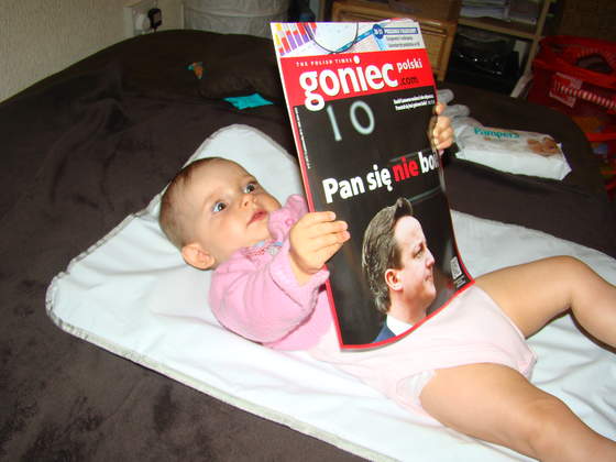 i czasem to przewijanie (a raczej walka z ujarzmieniem) zajmuje troche czasu. Moja corca ostatnio dorwala gazete ktora lezala w poblizu i teraz to nasz nowy sposob na przwijanie - prasowka hehe. Wklejam zdjecie jaka jest zaczytana