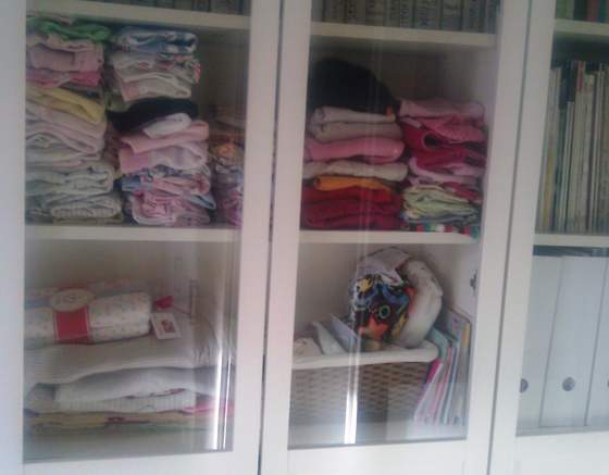 Tymczasem od rana wojowałam z rzeczami dla malucha, które się już uzbierały (kupione, wylumpowane, dostane) i wygrzebałam im miejsce na półkach w regale... docelowo cały ten regał będzie dla Małej, oprócz tego komoda... ten po prawej będzie cały mój ciuchowy (szyby przesłonimy materiałem), a planujemy zakup wyższego i całego przeszklonego do salonu - wtedy wszystkie książki tam wyemigrują....
