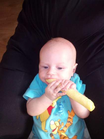 Chrupka kukurydzianego. Oblepiony jest cały ale potrafi nawet z pół wyciumkac tylko to trwa a ja w tym czasie mam chwile spokoju :)