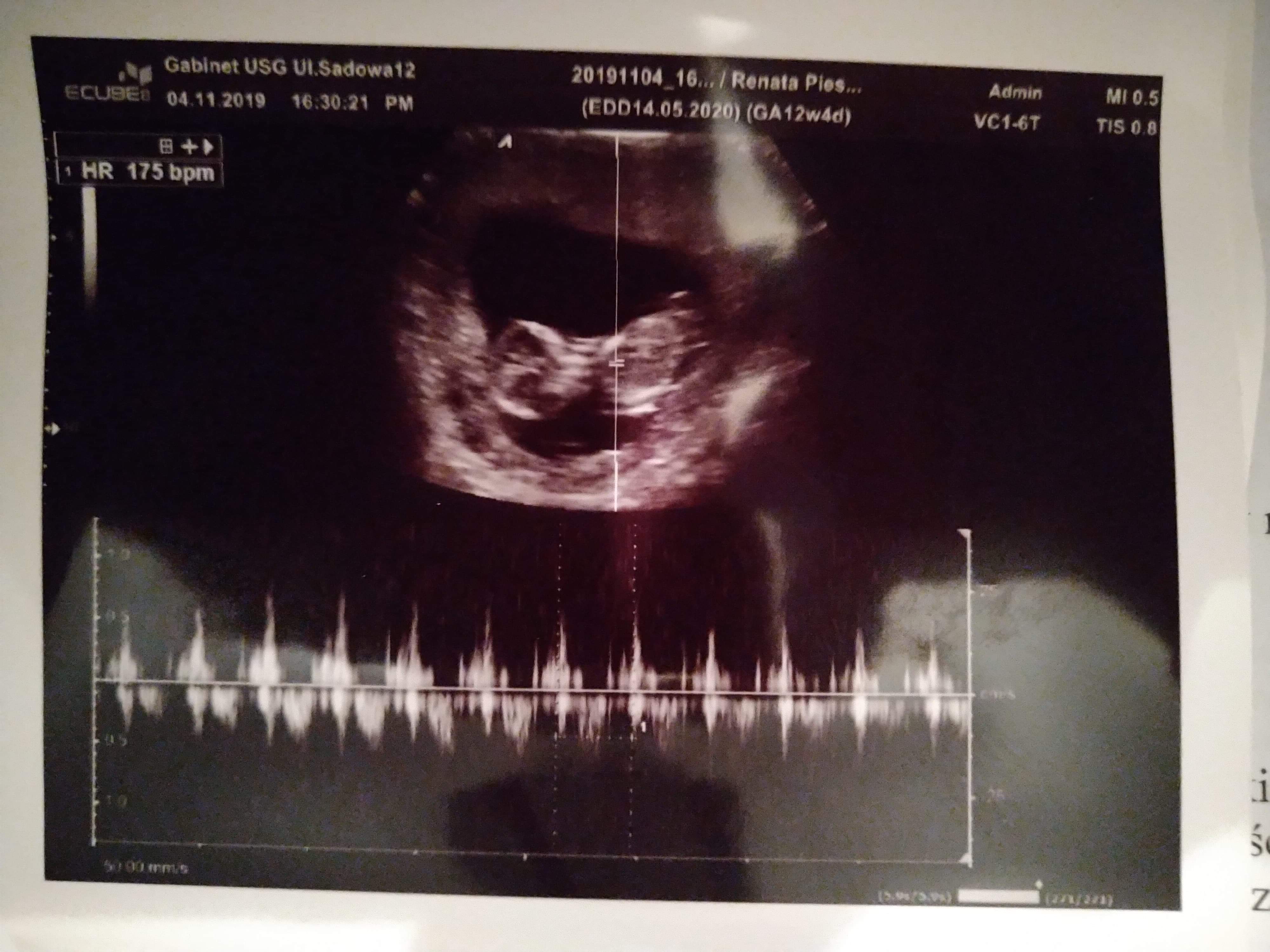 Dziecko ma 6,3 cm. Z USG 12+5, termin 13.05. Z OM 12+4, termin 14.05. Przezierność karkowa 1,04. Tętno 175/min. Nosek jest, rączki nóżki również. Mózg prawidłowo i serducho również. Dziecię jest bardzo ruchliwe i wiercące się. Do tego uparte i charakterne po rodzicach. Nie chciało dać się zmierzyć, ani obrócić z boczku i pokazać. A jak już zaczęło się obracać to tak szybko, że nie dało się nic zmierzyć i ocenić.
