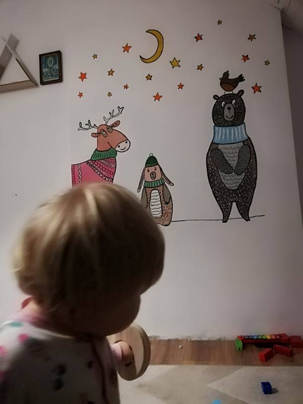 Nie pisałam wieczorem . Siedziałam z mężem i córką. Mała nam wczoraj zdjęła pieluchę i zrobiła kupę na jasny dywan. Dobrze ,że humorystycznie do tego podeszliśmy. Ogólnie kończę jej ściany w pokoiku. Pochwalę wam się zwierzątkami. Mąż będzie miał od jutra 5 dni wolnego to listwy przymocuje