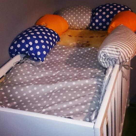 Łóżeczko tak na próbę "pościelone" muszę tylko obniżyć materac i wtedy będzie jak trzeba ;)