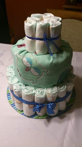 A ja skończyłam pieluszkowy torcik)) jestem z siebie dumna i bardzo się cieszę, że takiego gotowego nie zamówiłam bo pełno tego w necie, a taki 3-piętrowy to ok. 150zł