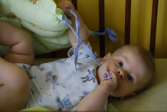 Ochraniacz - Franek miał, bo była zima, a łóżeczko stało tak, że baliśmy się przeciągów. Aniela nie miała. Po 4 mies. Franek robił z ochraniaczem takie rzeczy: