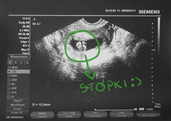 Cześć dziewczyny! Ja już po wizycie cała i szczęśliwa, bo wszystko jest ok. Kość nosowa widoczna, przezierność 1.0 , ilość wód płodowych w normie a i dzidziuś podrósł i wygląda na 13 tyg 2 dni- czyli prawie idealnie! Krwiak zniknął :-):-):-):-) czyli wszystko wraca do normy! Chcieliśmy podejrzeć płeć, ale dzidziuś miał złączone nóżki i nie chciał się ujawnić-a im bardziej pan dr chciał zobaczyć tym bardziej się chował,aż w końcu włożył rączki między nóżki (jakby wiedział,że podglądamy) i pozamiatane;-) wiecie,zwykle nie wrzucam do internetu zdjęć z usg,ale dziś nie umiem się powstrzymać, bo jedna fotka mnie rozbroiła- moje dziecko ma CRL 65,8 mm a same stópki mają 12,3 mm!!!