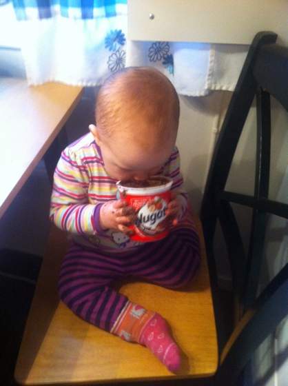 A tutaj moja rozrabiaka. Cwaniak maly wie gdzie trzymamy slodkie. Podsunela sobie krzeslo, otworzyla szafke i wyciagnela czekolade