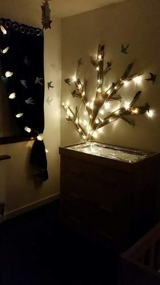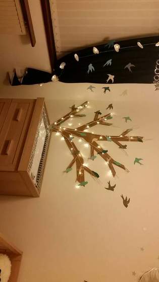 Choinka u nas ubrana wstawie fotke. Dodatkowo kiedys zrobilismy z R takie drzewko na sciane a dzis dorobilam ptaszki i poprzyklejalam. Jeszcze musze firanke kupic bo okno z samymi zaslonami niezbyt super wyglada i na firance tez bedzie lecialo troszke ptactwa (fotka).