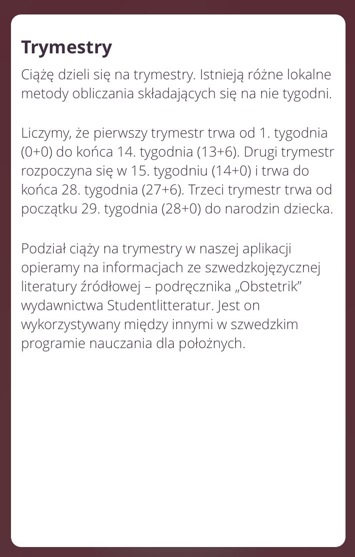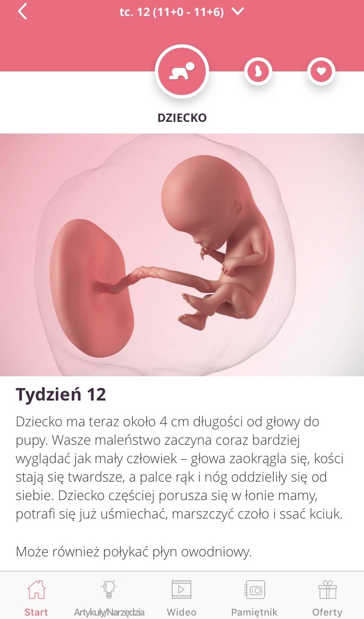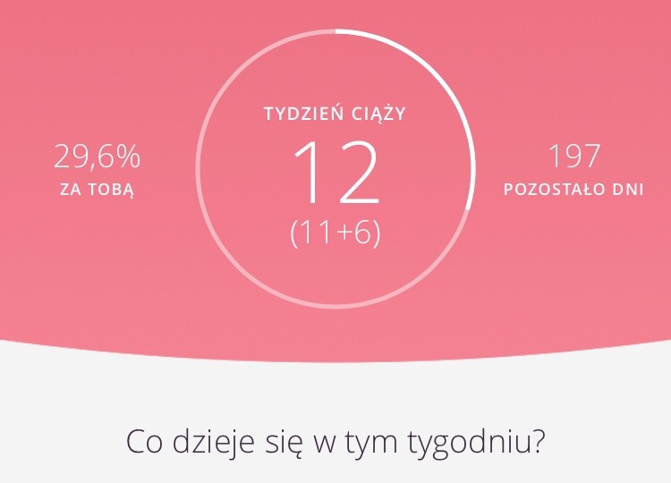 Na panelu głównym ładnie wyświetla jaki jest wiek ciąży (który to tydzień oraz skończone tygodnie), który miesiąc (kalendarzowy i ciążowy), trymestr oraz tydzień po tygodniu jaka powinna być wielkość dziecka.