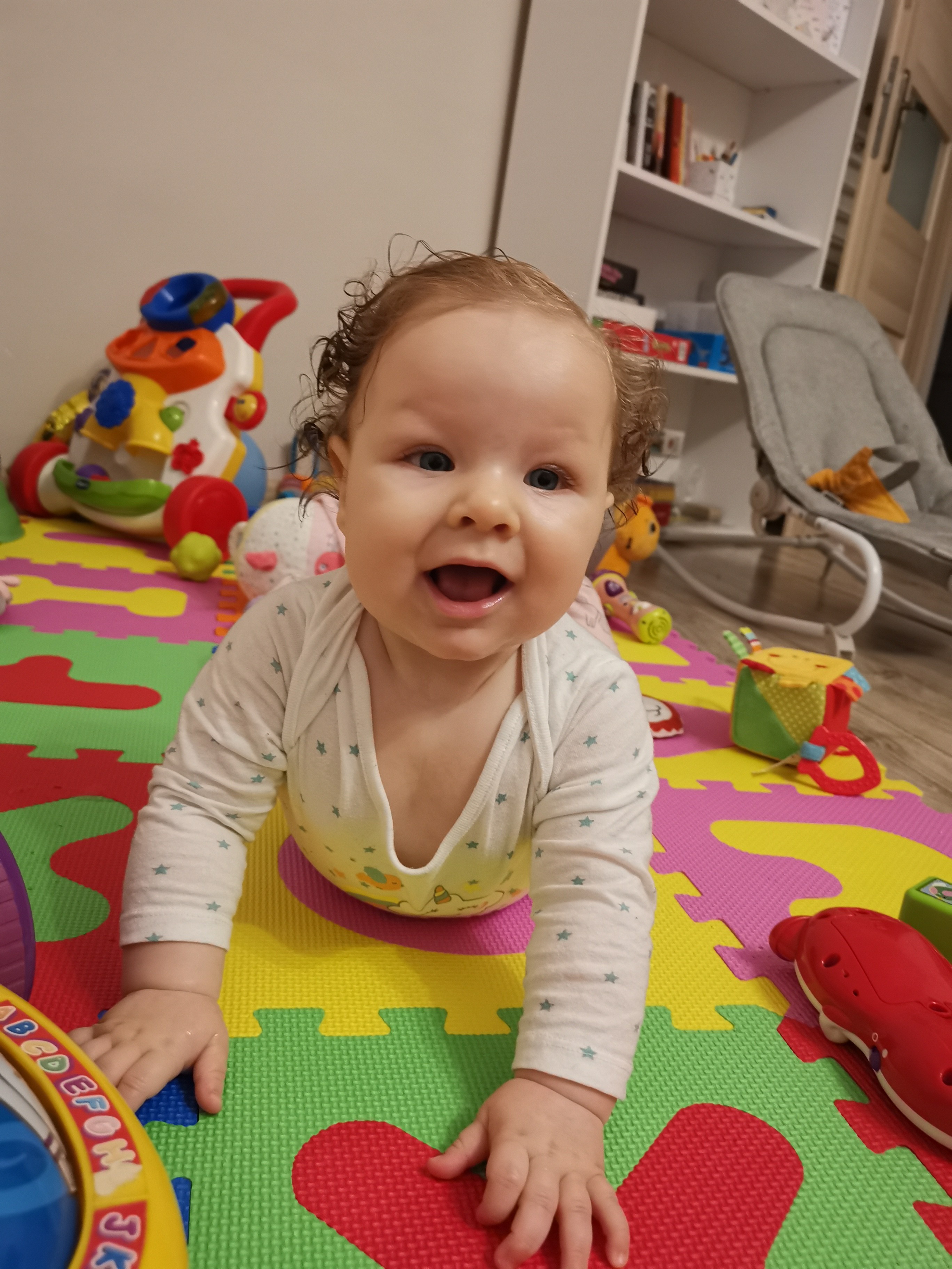 I nie, nie bawi się nigdy wieczorem po kąpieli tylko idzie spać, ale dziś wyjątek, bo drzemkę miała do 17:20 a chciałam ją wcześniej wykąpać o 18 bo musiałam posmarować ją maścią, odczekać i potem sterydem a nie chcialam tego robić jak byłaby fest zmęczona, bo byłby płacz, jakbym ją z każdej strony smarowała, przekręcała itp