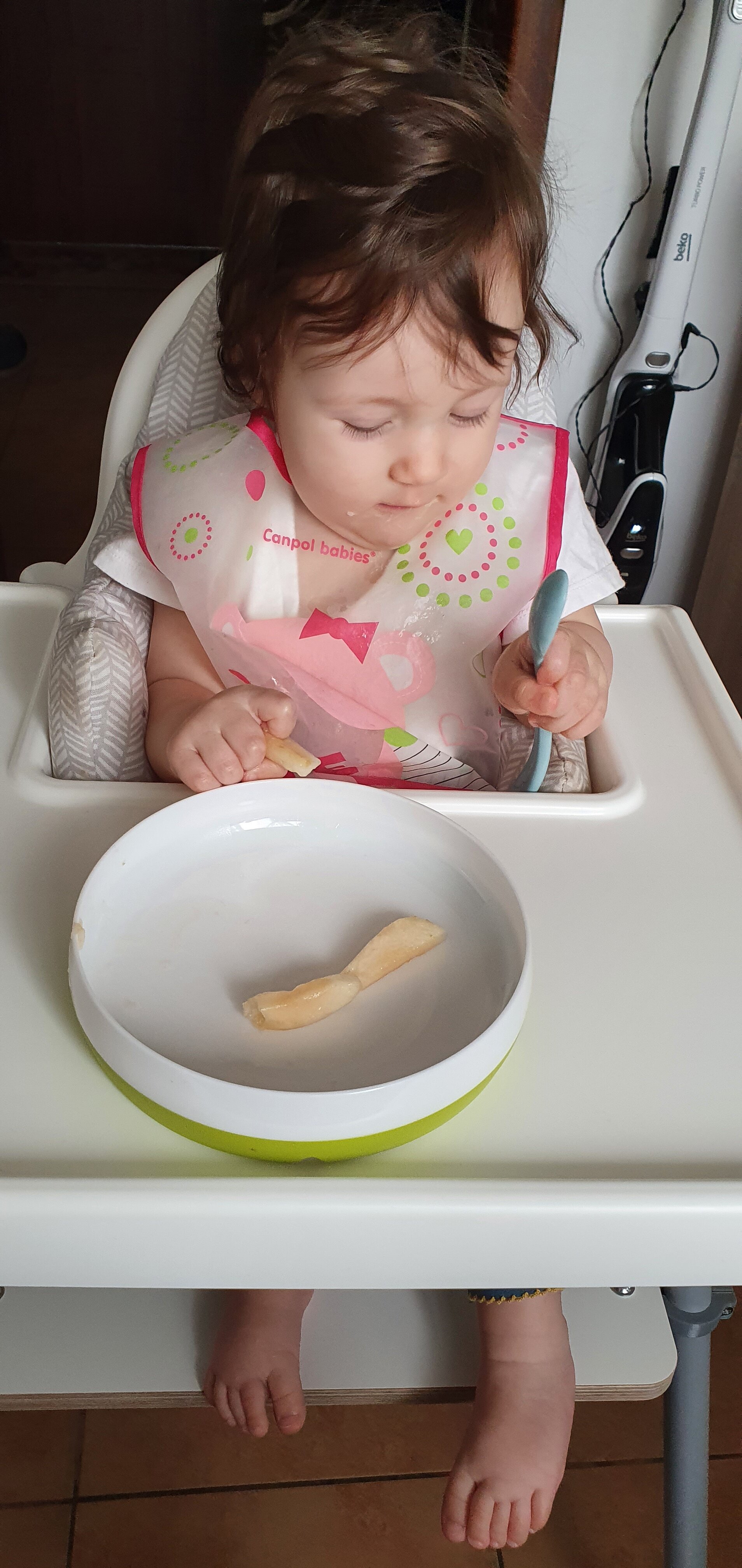 Tutaj dla przykładu akurat nie makaron a gruszka bo na śniadanie miałyśmy owsianke z jabłkiem i cynamonem, a dodatkowo pokroiłam jej do jedzenia gruszkę.I dajesz makaron w całości?