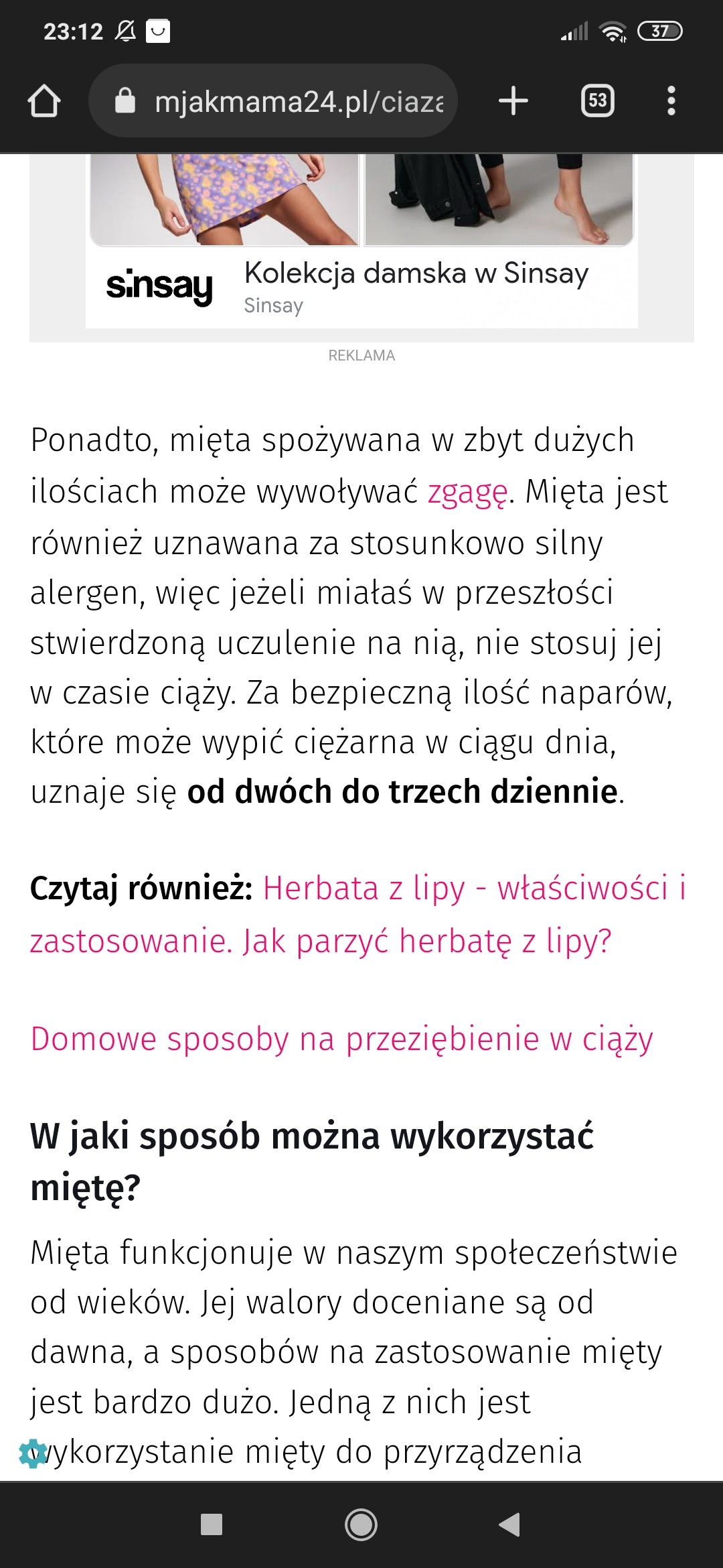 Co do mięty, czytałam że tą pieprzową można pić w ciąży, natomiast jest mięta polna jest szkodliwa, bo jest bardziej eteryczna, ale do końca pewna nie jwstem