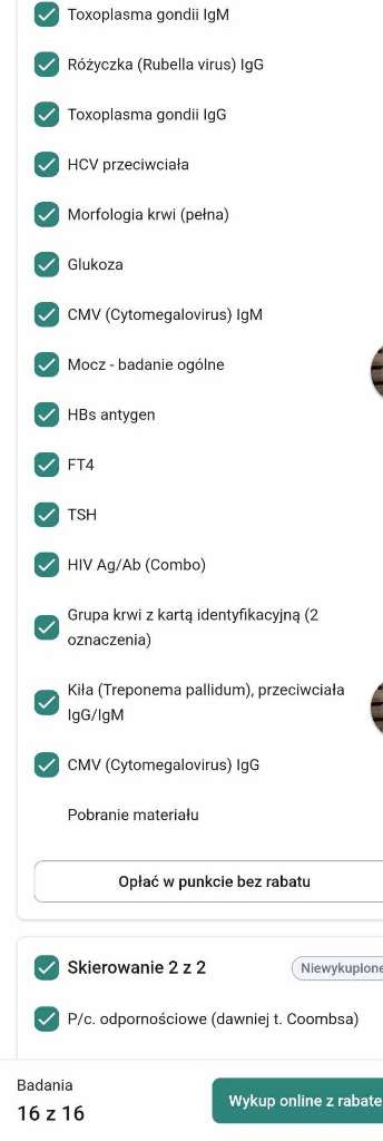 ja mialam te 16 badan, plus przez to ze wyszla mi cytomegalia musialam zrobic ta awidnosc wiec dodatkowo jeszcze 110 zlTo z ciekawości jakie robicie badania że aż tyle pieniędzy wam wychodzi za nie? Ja jak sprawdzałam na stronie alab to max 350zl wyliczyłam![]()
