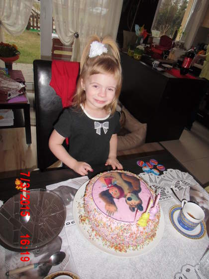 Ja tez robiłam sama tort,pierwszy raz,wyszedł ogromny:szok:,z masa chałwowa i konfitura truskawkowa na kakaowym biszkopcie i na wierzch masa smietanowa malinowa i posypka:-D to pomysły Goski;-) ale obrazek był z opłatka bo my tych cukrowych nie lubimy:no: za to byl obrazek z Masza ktora jest kropka w kropke jak Małgoska;-)