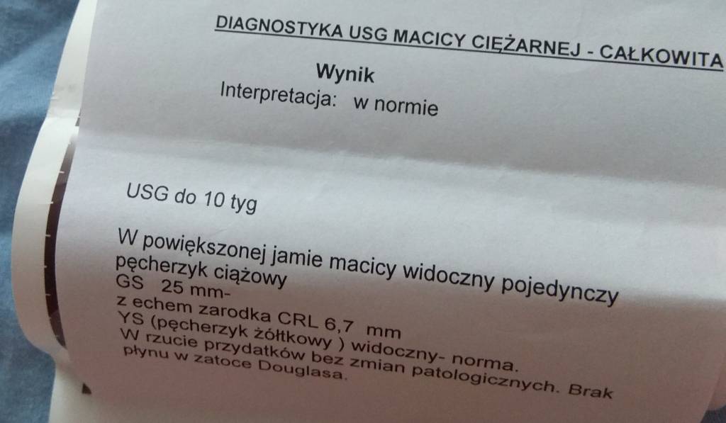 Witajcie. Zacznę od początku. Ostatnia @ miałam 02.02.2019. kochaliśmy się z mężem często, ostatnio w dniach 16-18.02.2019, potem mieliśmy remont w domu i męża delegację więc brakowało sił i chęci by dalej próbować. Generalnie na 18 wyliczyłam sobie owulację, ale objaw jej nie było. Jakie było moje zdziwienie kiedy 28 zrobiłam test ciążowy i wyszedł pozywyny. Zaraz udałam się do ginekologa po zaświadczenie że względu na czynniki szkodliwe. Kazał mi przyjść za dwa tygodnie. Na kolejnej wizycie stwierdził że ciąża jest młodsza niż by wychodziło z om bo nie ma bicia serca itd. załamana wyszłam z gabinetu. Kazał mi się zgłosić po kolejnych dwóch tygodniach. Tak się stresowałam że po ponad tygodniu udałam się do innego lekarza, który stwierdził że ma kiepskie USG ale widać ciążę, GSL o wielkości 25 mam, zarodek z echem o wielkości 6,7, ciałko żółte w normie. Lekarz stwierdził że ciąża młodsza niż wskazuje na datę z om bo ocenia na 6-7 tydzień a powinien być 8. Dla pewności kazał mi zrobić Beta HCG, wynik z 28.03 - 95666,7, wynik z 30.03 106723. Kiedy powinnam udać się do lekarza by znowu że lasami w oczach nie czekać na bijące serce. Tak strasznie się boje kolejnej wizyty. Ciągle wymiotuje, boli mnie głowa. Mam 37°C oraz jestem zmęczona.