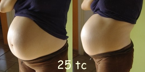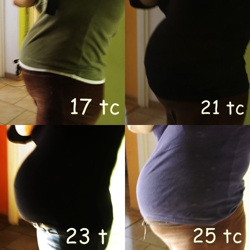 ale zrównuje się z brzuszkiem jak z Dobrusią byłam - mam nadzieję, że nie pobije brzucha z poprzedniej ciąży, bo juz mam wrażenie, ze skóra nie ma się jak naciągać. A rozstępów nie widać mocno, bo one z poprzedniej ciąży są i maja srebrny kolor, w tej mi jeszcze żadne nie wyskoczył ;-)