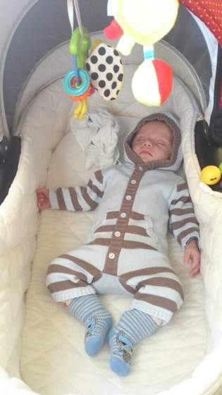 aisha dajesz malemu jeszcze koc do wozka? Ja dziś ubrałam ją w ciepleszjy kombinezonik niz Twój mały ma na tym zdj. u mnie wiało dziś, w cieniu chlodno, w sloncu gorąco nie wiadomo jak ubrac :/ moja tak nie układa nóżek