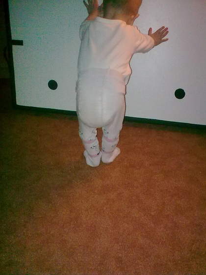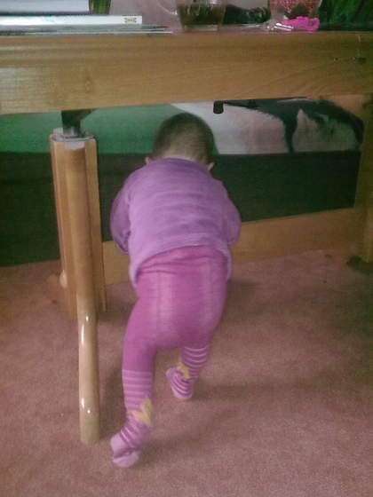 Naprzemienność jest już dawno w kopaniu więc dlatego łatwiej mi było ją nauczyć raczkowania. Niestety dżinks jest pomysłowy także na podłodze Jak coś się nadaje do podparcia to od razu staje czy to krzesełko do karmienia, poprzeczka w ławie, zgrzewka z wodą czy pufa a jak nie to i tak dojdzie do łóżeczka i złapie za szczebelek i stoi. Pocieszam się tylko, że od dziś zaczyna wstawać z kolanka a nie tylko podciągając się na rękach. A ja muszę wszystko z dołu regału pościągać bo interesi ją bardzo. Właśnie wstała i podniosła na swojej głowie przewijak Nie mam siły, jutro robimy przemeblowanie, niestety w jednym pokoju jesteśmy i nie mam gdzie powynosić gratów, a ona korzysta. Trzeba jej inaczej ustawić ten kącik ;-)