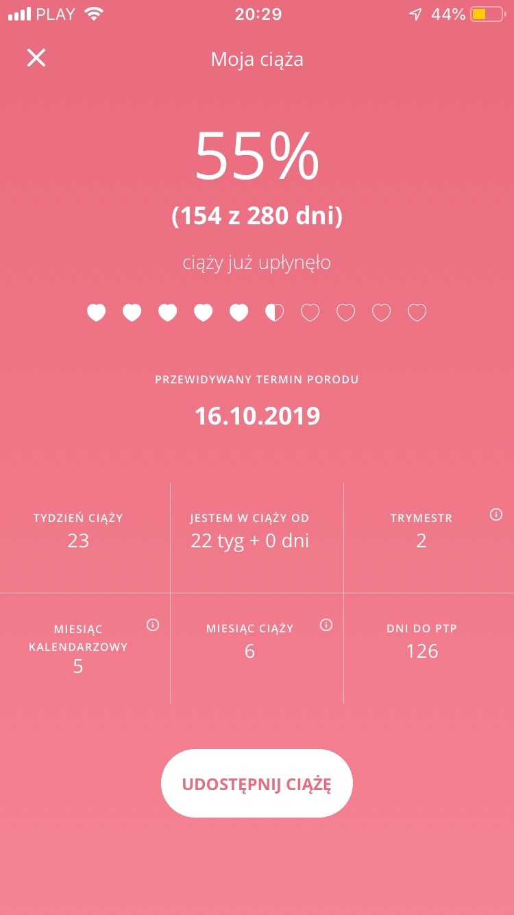 No to ja jestem w 22tyg0 dni czyli 23. Jak poszłam do położnej i powiedziałam ze jestem w 19 tyg i 3 dni to wpisała 20 tydz. Pokaże wam w aplikacji jak mi pokazuje