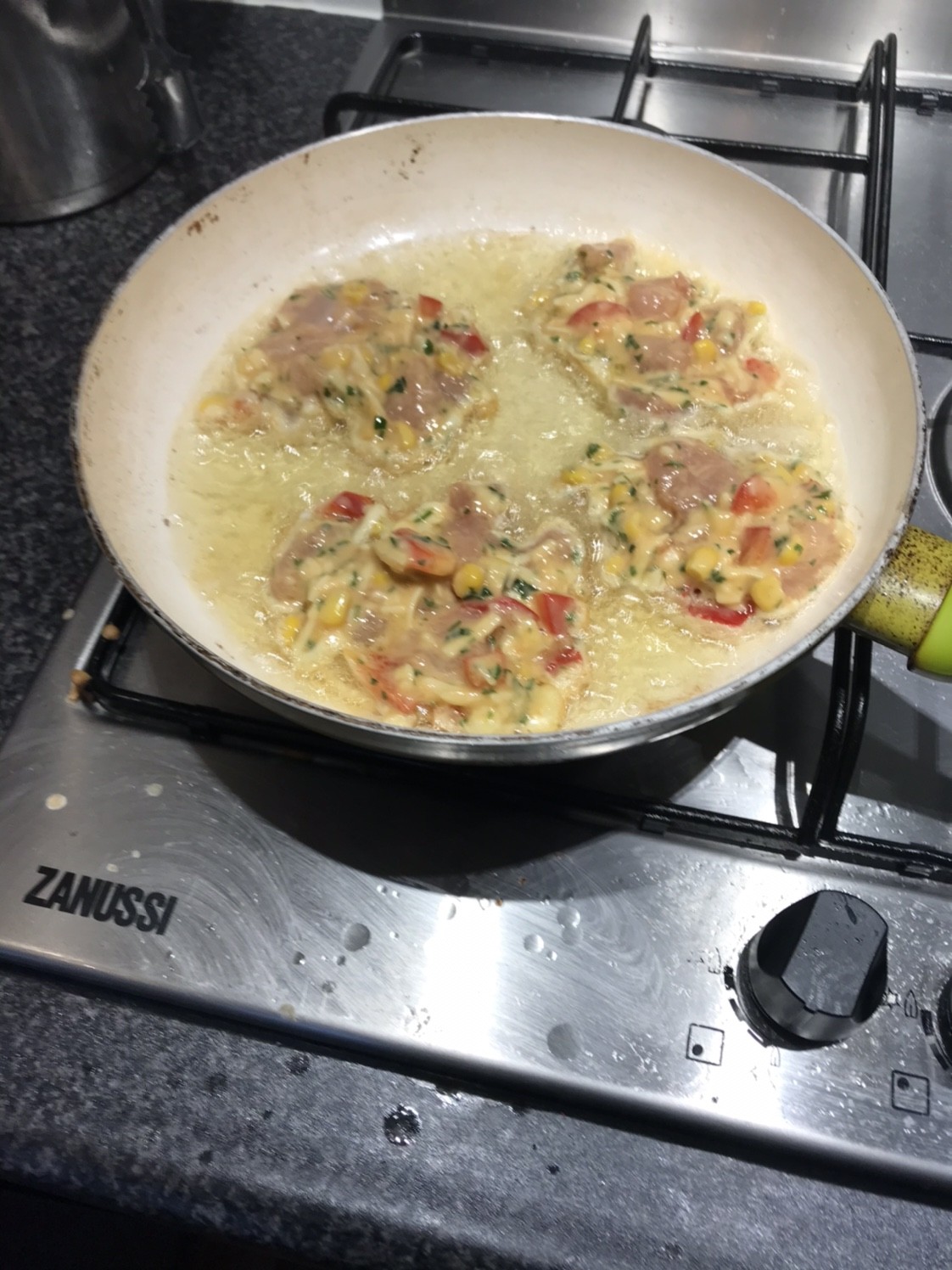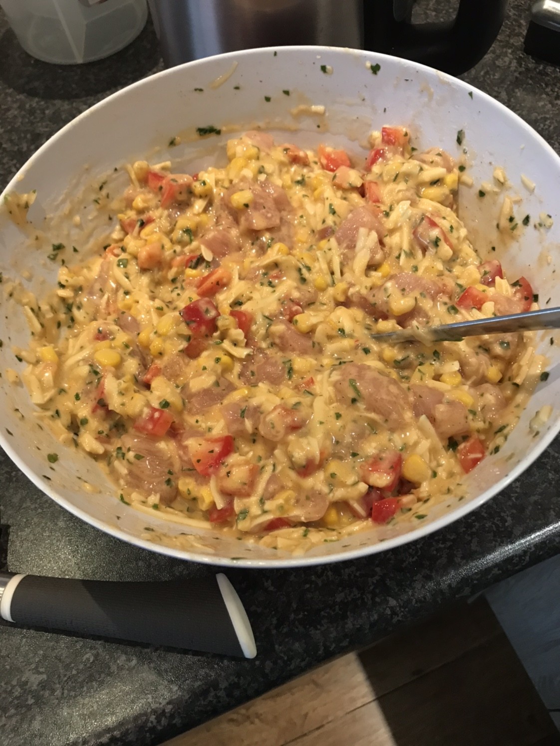 Pierś z kurczaka, papryka czerwona, kukurydza, ser żółty, jajka i trochę maki [emoji5]na koniec dałam pietruszkę zielona