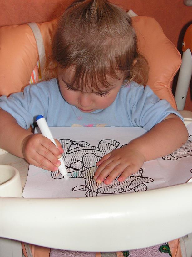 A ja kupiłam Oliwce książeczki do kolorowania, ale nie takie zwykłe, tylko takie, kóre mają zasuszony barwnik w obrazku i jak się koloruje po nim specjalnym, wodym pisakiem, pojawia się kolor (można również malować pędzelkiem zamoczonym w wodzie, ale ten pisak jest zdecydowanie wygodniejszy). Jak dla naszych maluchów super sprawa, bo kolorowanie jest łatwe i czyste, a wychodzi jak rozwodnionymi farbkami. Bawiłyśmy się chyba z godzinę