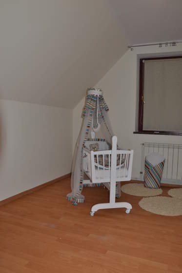 Brakuje jedynie: mebli, w tym łóżeczka z właściwą pościelą (błękit/róż), firanki, która jest, ale czeka aż się zbiorę i ją przepiorę i powieszę, żyrandola, lampki do kompletu pościeli, 2-óch wygodnych foteli, co by goście mieli gdzie swoje szanowne 4litery posadzić i wzoru na ścianie (jakiś miś + kółeczka dookoła sufitu dodające ogromnego uroku).