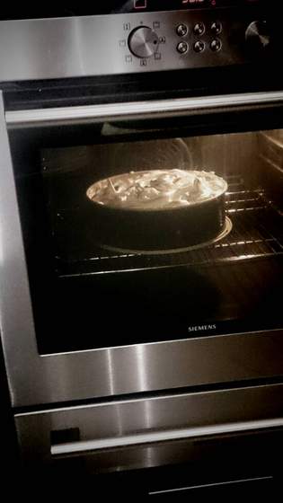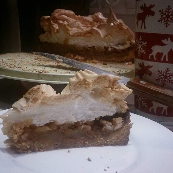 -Na gotowy (może być ciepły) kruchy placek Wyłożyć wysmażone jabłka, a na nie ubitą pianę.