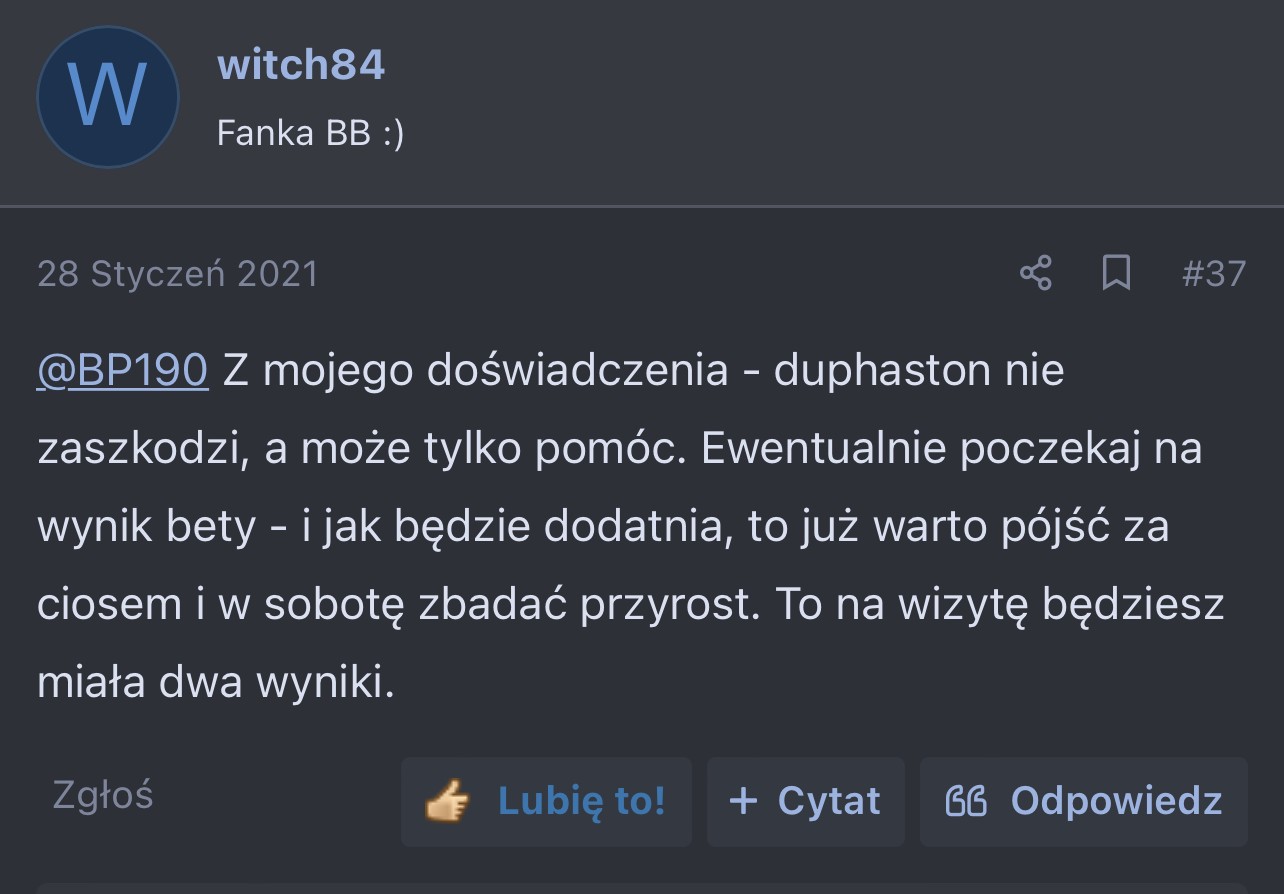 W styczniu 2021 zapytałam na forum, czy brać duphaston, bo właśnie zrobiłam test i mam pozytywną betę, a jestem po 2 poronieniach.
