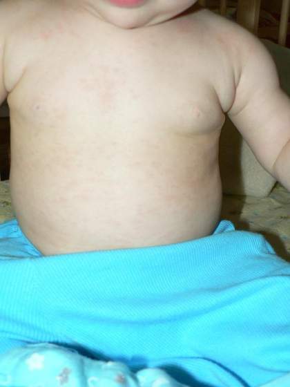 Od wczoraj wieczora pojawiła sie lekka wysypka na tułowiu i szyi. Pomyślałam sobie... kurde pewnie te miśkopty co jej wczoraj pierwszy raz dałam. Dziś rano patrze - plamki bladoróżówe jakby troche wiecej ale nie bardzo. Po południu zmiełam pieluche a tam multum tego dziadostwa.... Przeleciałam "pierwszy rok dziecka", wszystkie choroby z objawami skórnymi. No i jak w pysk strzelił - wysoka gorączka po 3 dniach ustępująca (od soboty do wtorku) - dziś już bez gorączki zupełnie. Na karku i szyi miała takie zgrubienia oczywiscie sobie tlumaczyłam powiekszone wezły tym migdałem. Mogą występować objawy zapalenia gardła... teraz nie wiem czy zaropiały migdał to osobna sprawa czy różyczkowa i czy antybiotyk był konieczny. \Pod naciskiem wysypka blednie.