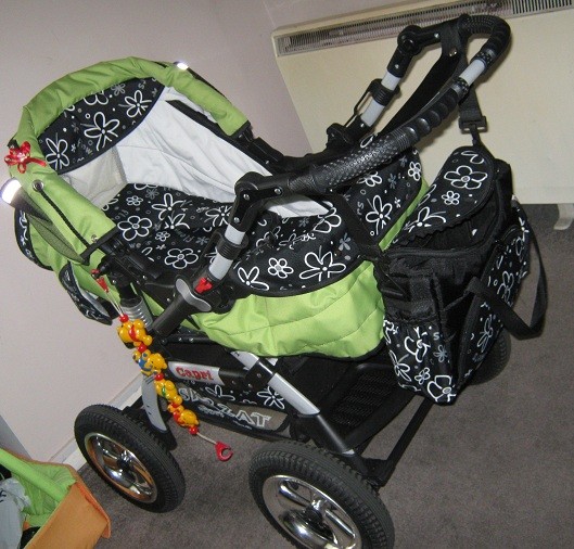 ale nic na to nie poradzę no i musi zostać która też pasuję do wózka ale mam bzika na punkcie zielonego i nakręciłam się na tamtą. Teraz wózek z nową torbą i nowym materacykiem wygląda tak