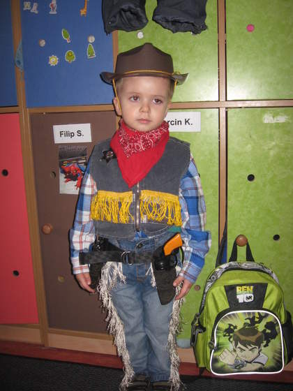 U nas już ok tzn Mały sika normalnie, a ja nie naciągam za mocno. Wczoraj pojechaliśmy do przedszkola o 9-tej, pobyłam trochę i zostawiłam Marcina. Odebrałam o 16 i było wszystko ok. A tu mój kowboj, tuż przed wejściem na salę :-)