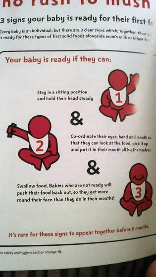 Ja ostatnio byłam na szkoleniu i mam takie info, po angielsku ale ogólnie chodzi o to by dziecko już w miarę ładnie siedziało i trzymało główkę nie chodzi tu o zupełnie samodzielnie siedzenie. I żeby była ta koordynacja ze jest w stanie podnieść samemu jedzenie i wsadzić do buzi no i do jakiegoś tam czasu dzieci nie umia przełknąć takiego pokarmu i maja refluks