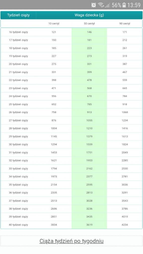 Tak tez patrzyłam na te tabelki i doszłam do wniosku ze mamy jakis 25 centyl , wiec jest wszystko Ok , L&G urodzili sie spore jak na wcześniaki , ale teraz dosc wysocy a chudzi bardzo niestety moj brzuch jest tak duży , ze wyglądam jakby dziecko było w 75 centylu ha haZnalazłam taką tabelkę, na zielono zaznaczony 50 centyl czyli uśredniona waga jaka powinna być, ale zarówno 10 jak i 90 centyl to dalej jest w normie, tylko znaczy że dzidzi jest drobne albo większe po prostuZobacz załącznik 855808