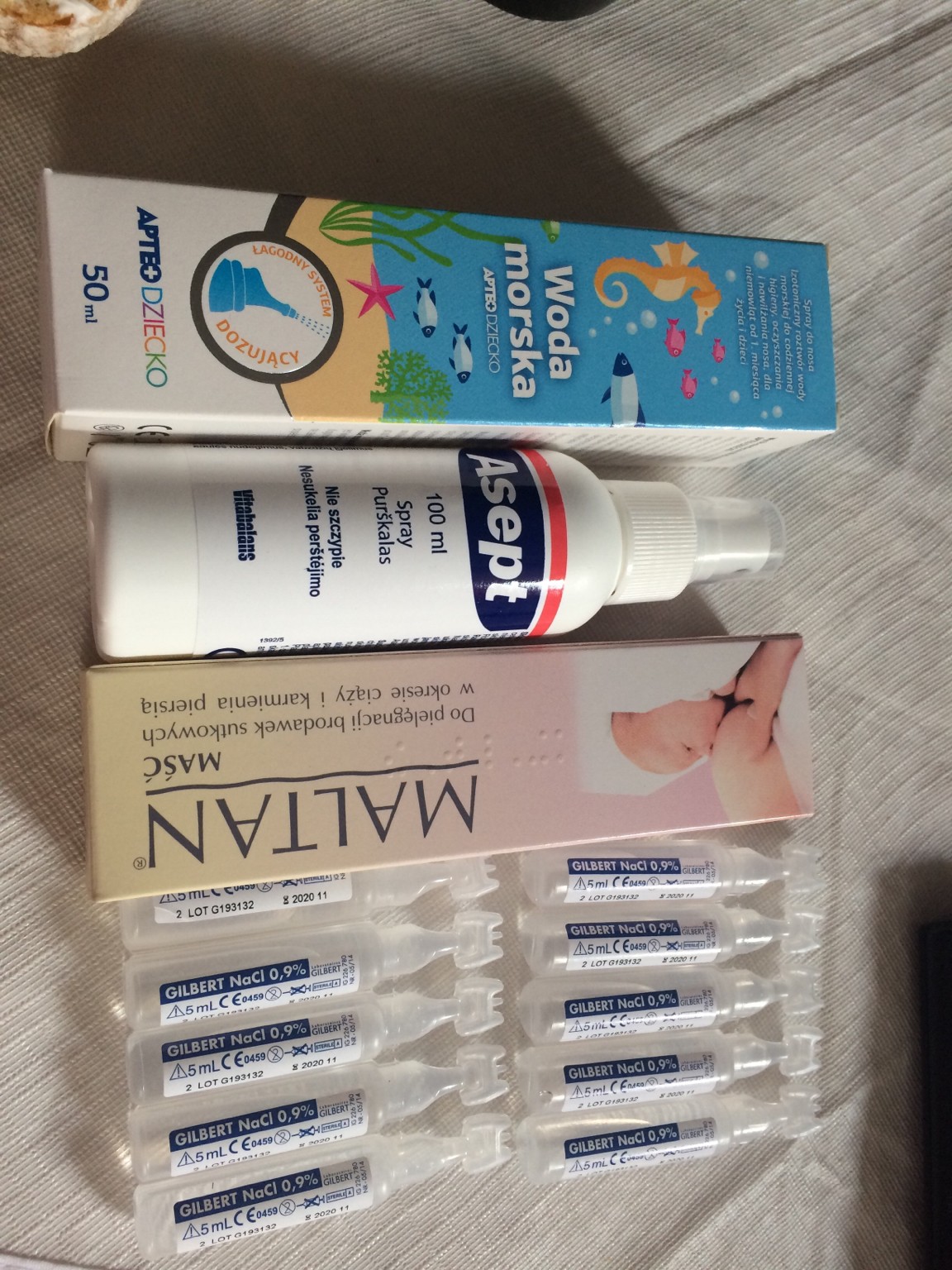 A wczoraj w aptece kupiliśmy te ostatnie produkty do pielęgnacji dzidzi i już lista higieniczna zamknięta. 48 zł za to, ale ceny dobre i na Allegro podobne, plus wysyłka by była także nawet taniej. A ten środek do pielęgnacji pepuszka to pani mi dała zamiennik octeniseptu i jest tańszy i tak samo dobry
