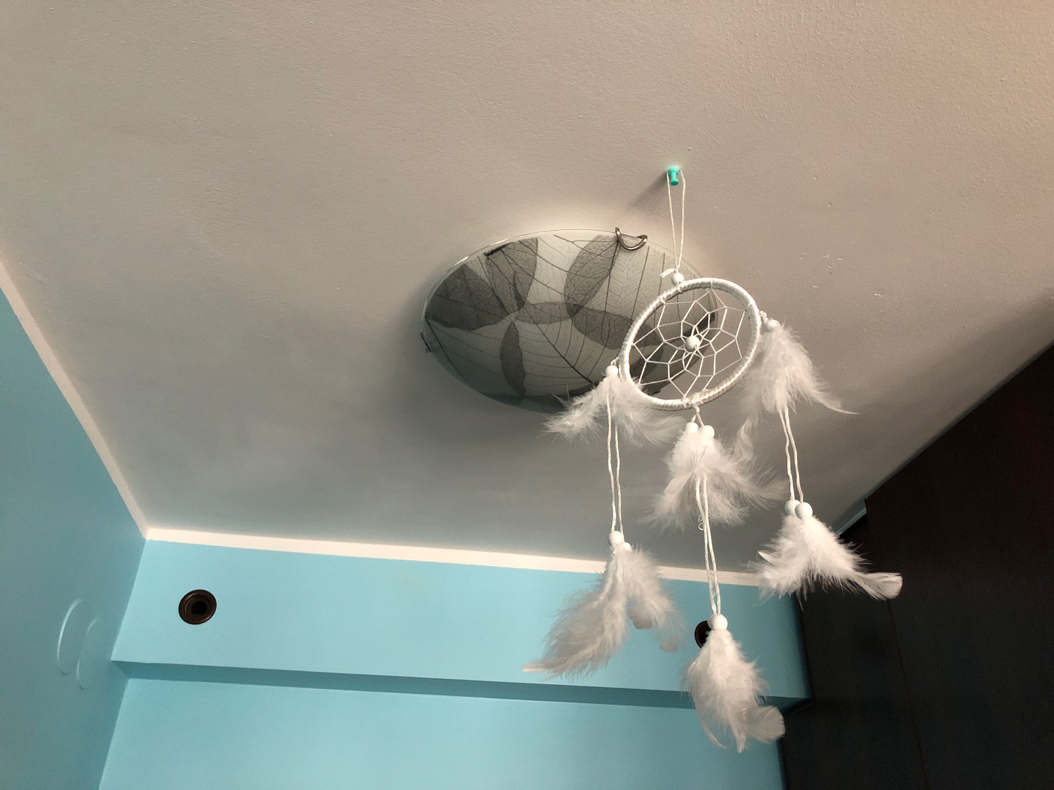 Ostatnio mój Bartek nad morzem wybrał taki łapacz snów i tak go zamontował koło wejścia, teraz jedynie ten klosz od żarówki do wymiany na jakiś zwykły chyba biały żeby pasowało.