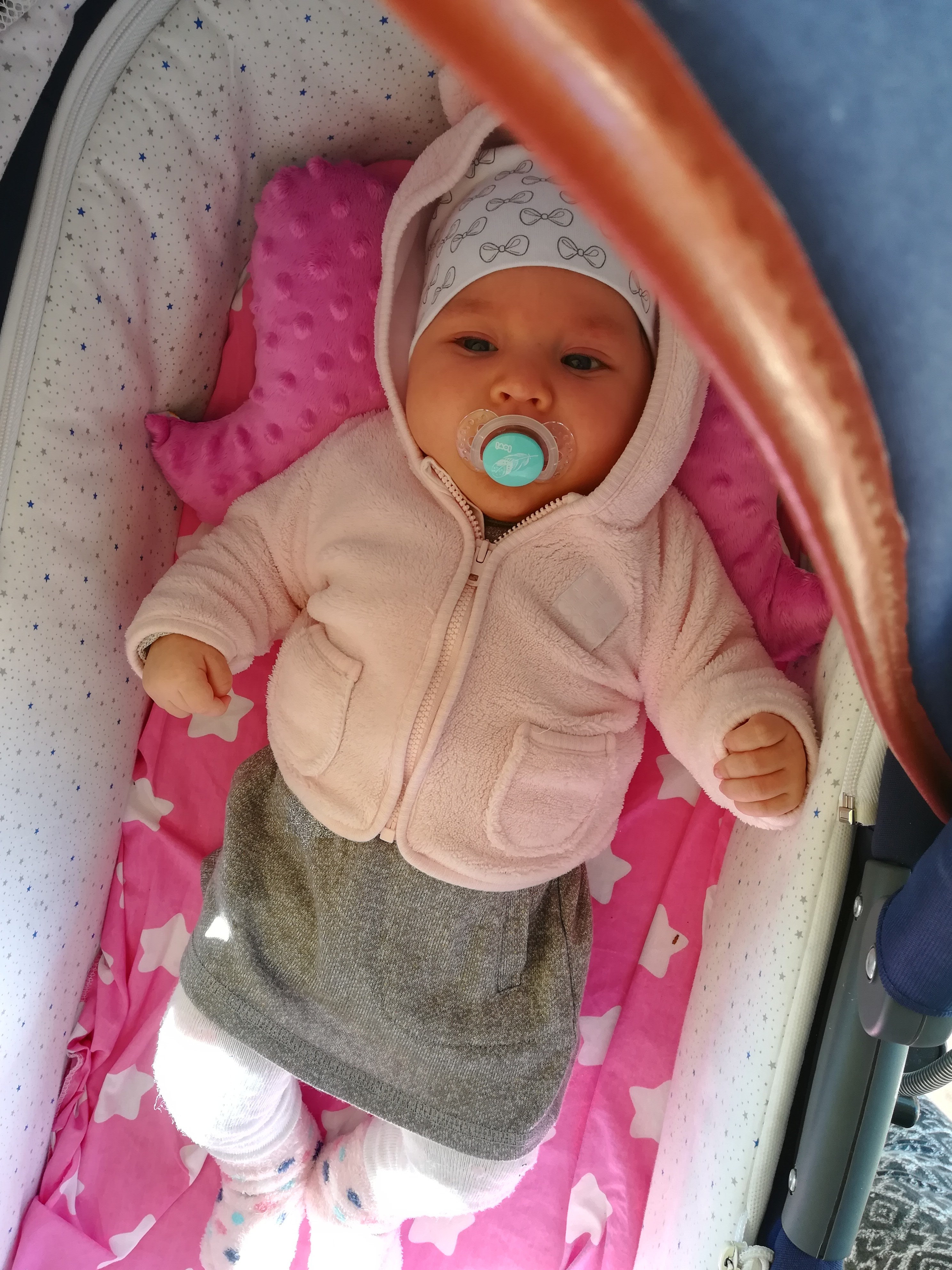 To Maja tak z kolei ze ślimakiem który wisi nad leżaczkiem się bawi. Rączka uderza [emoji23] i patrzy jak dynda [emoji23]Moja leży ba macie, ja jestem w kuchni i słyszę że uderza o grzechotki. Myślałam że przypadkowo jej się udaje ale nie. Z