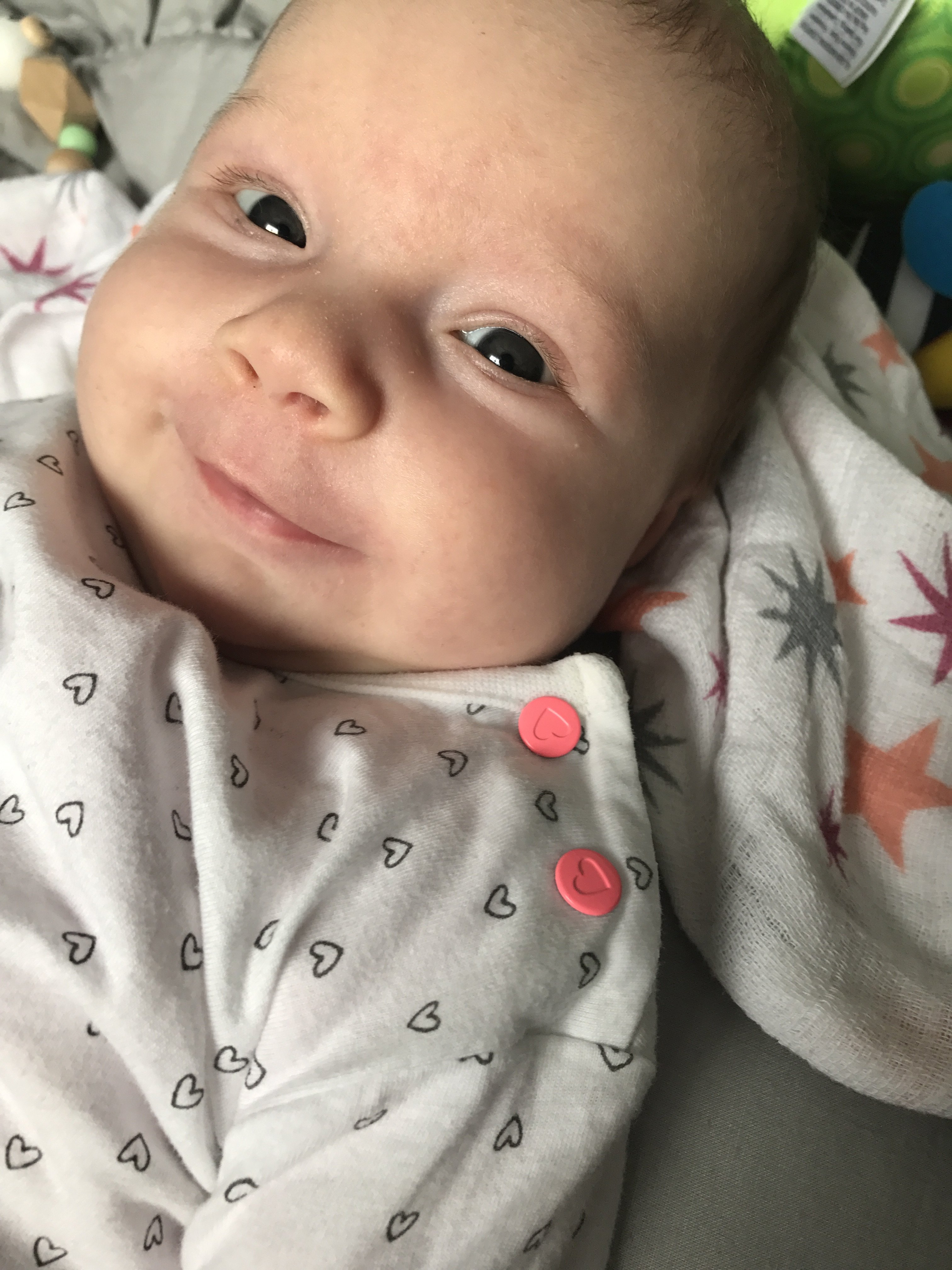 Ładnie unosi główkę, fajnie trzyma już zabawkę i się bawi, a także pięknie uśmiecha się do rodziców [emoji173]️