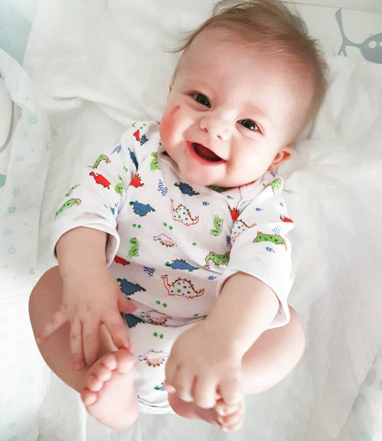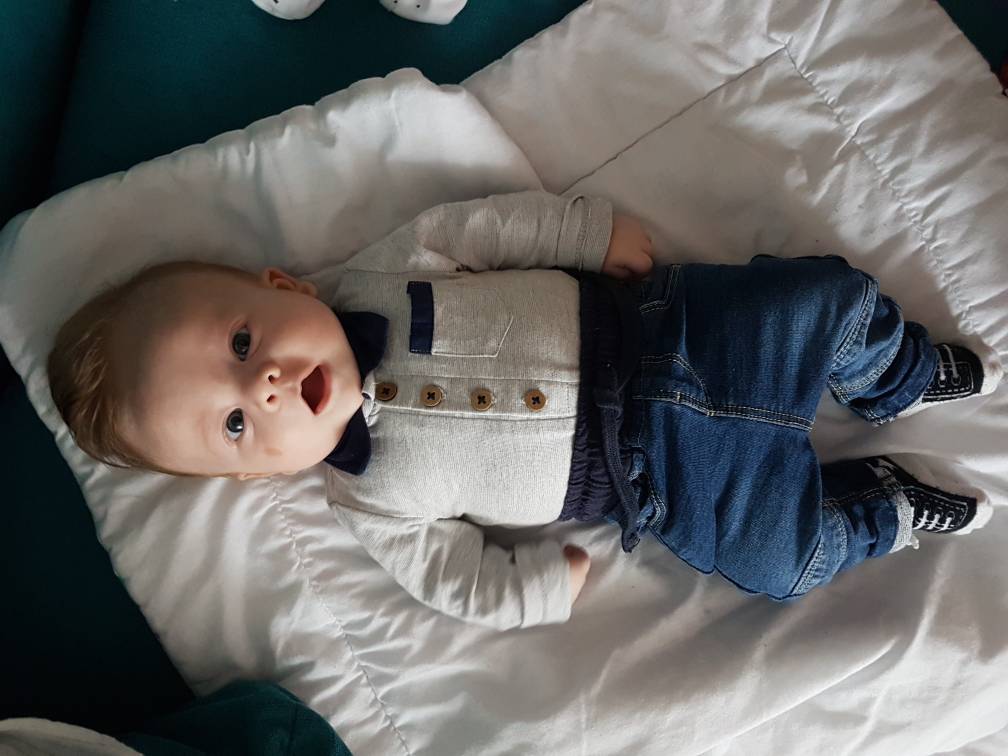 rozwija się fajnie- wkłada już palce stopy to buzi, uśmiecha się ciągle. Obroty z pleców na brzuch już bardzo sprawne a od kilku dni z brzuszka na plecy się czasem udają