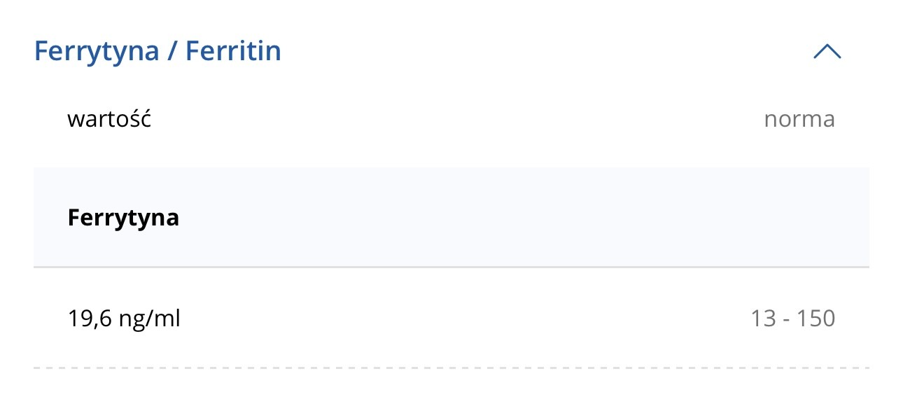 Ja pół roku temu miałam ferrytyne 8, po miesiącu małej suplementacji ale i pilnowania się diety wzrosła do 45, teraz jeszcze nie badałam.Dziewczynki, a jaką macie ferrytynę, badałyście ją ?